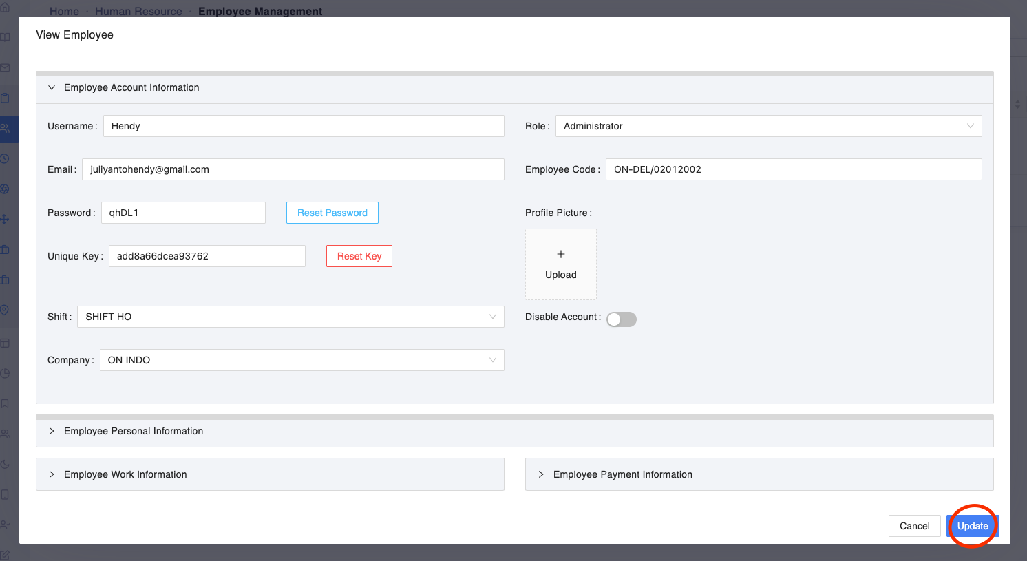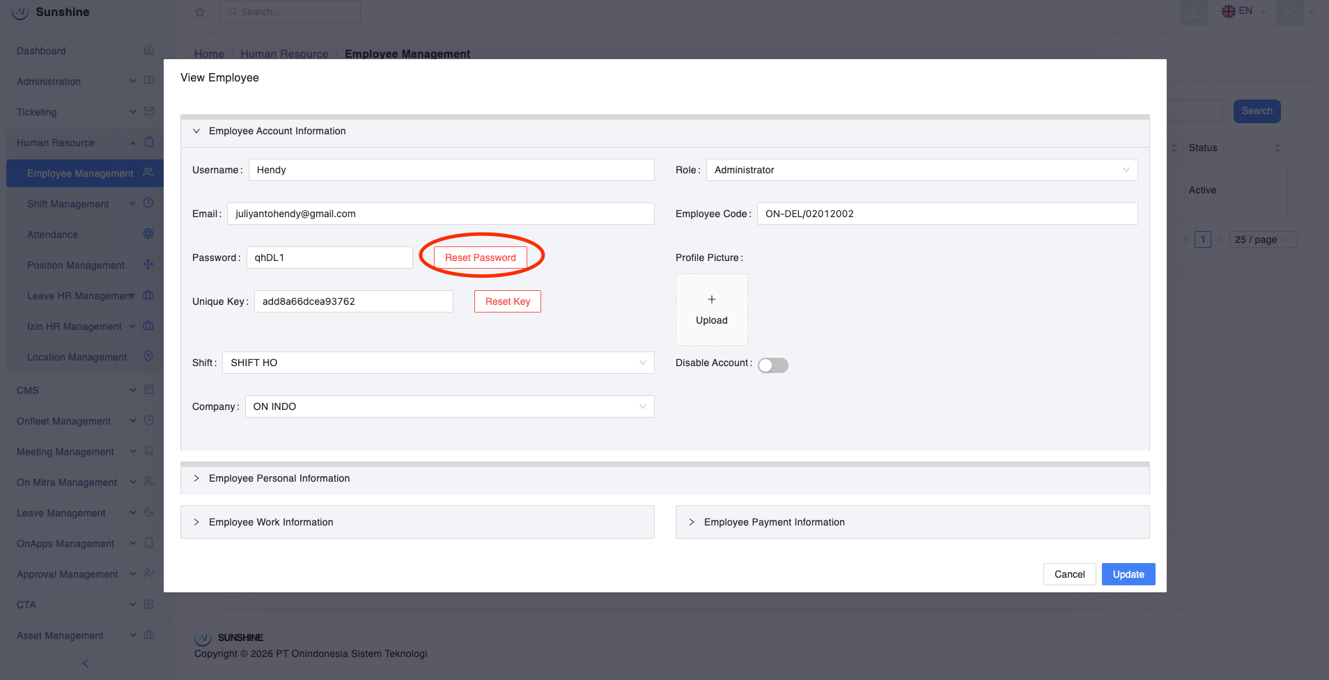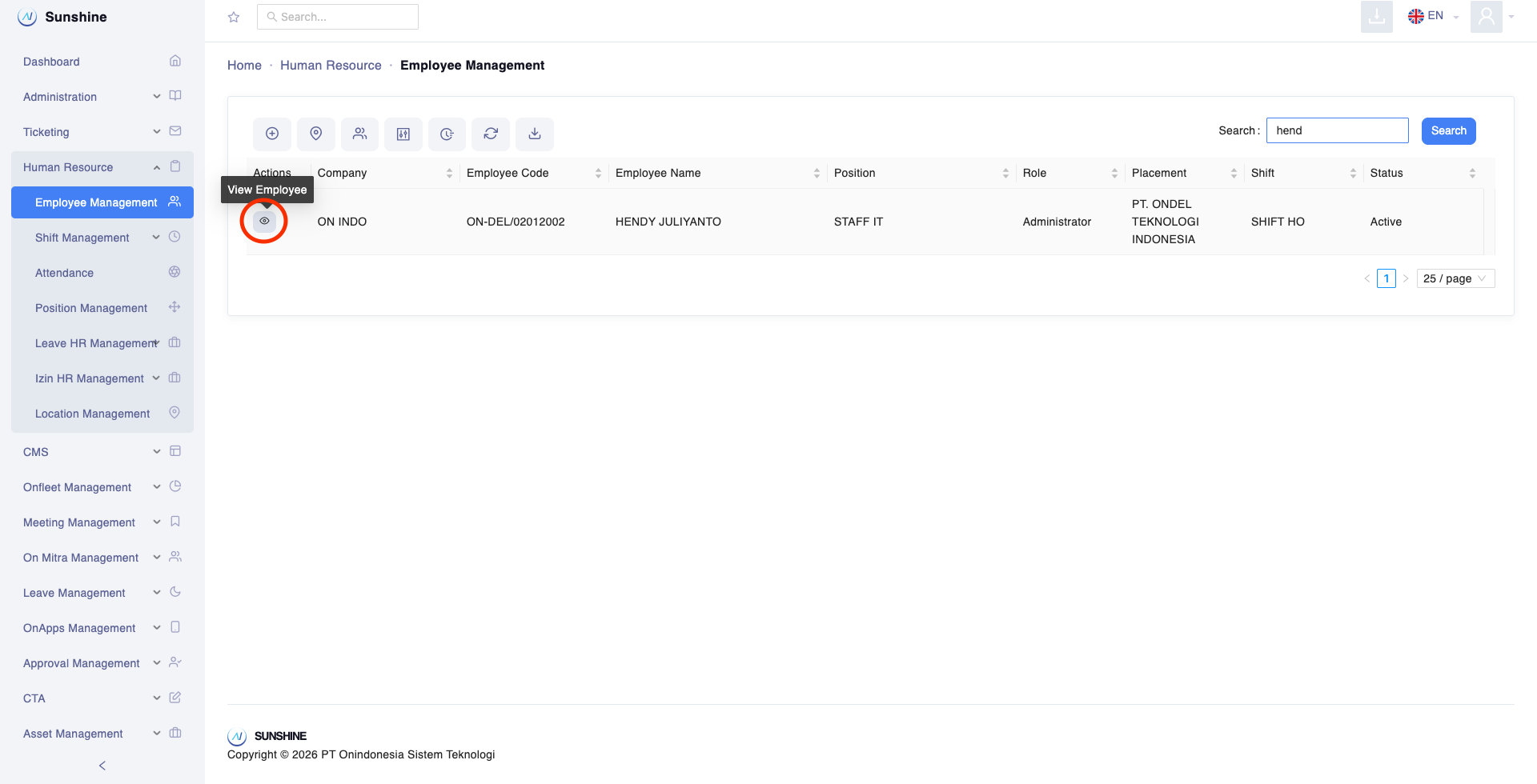 - Silahkan menuju sidebar sebelah kiri, klik Human Resources > Employee Management, kemudian klik icon VIew Employee yang berada di table