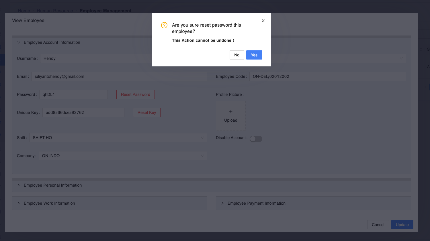 - Setelah klik reset password, akan ada dialog konfirmasi. klik yes jika yakin ingin reset password. setelah itu klik tombol Update