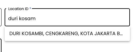 - Untuk location id, ketik kelurahan, kecamatan, kota, provinsi, atau kode pos, kemudian pilih satu menu dropdown untuk memilih location id