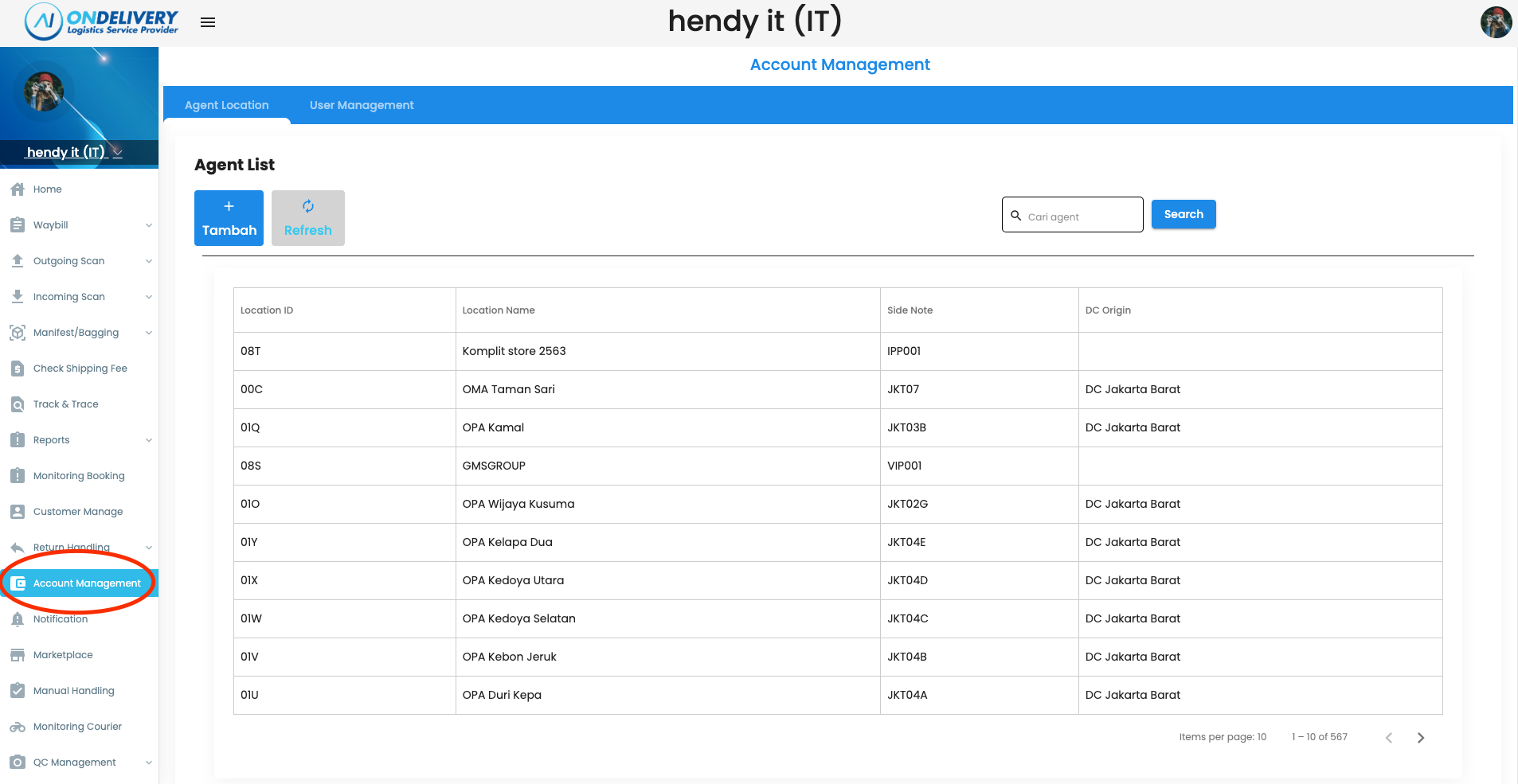 - untuk membuat lokasi customer baru untuk input, user customer harus mendaftarkan lokasi. Klik menu Account Management untuk membuat Agent Location