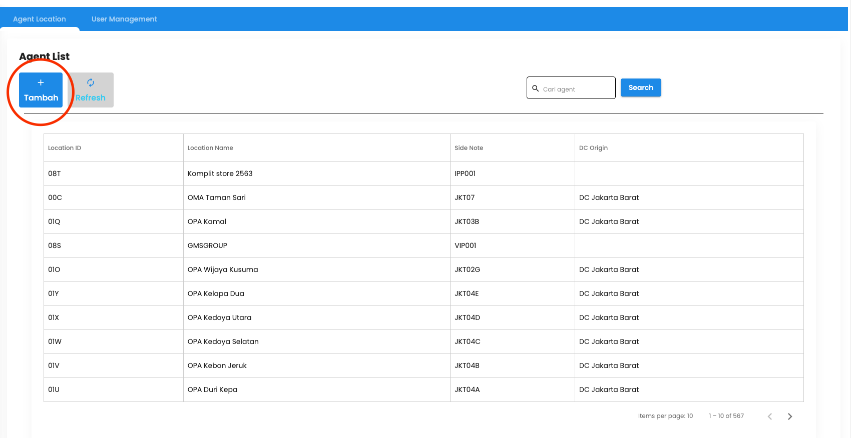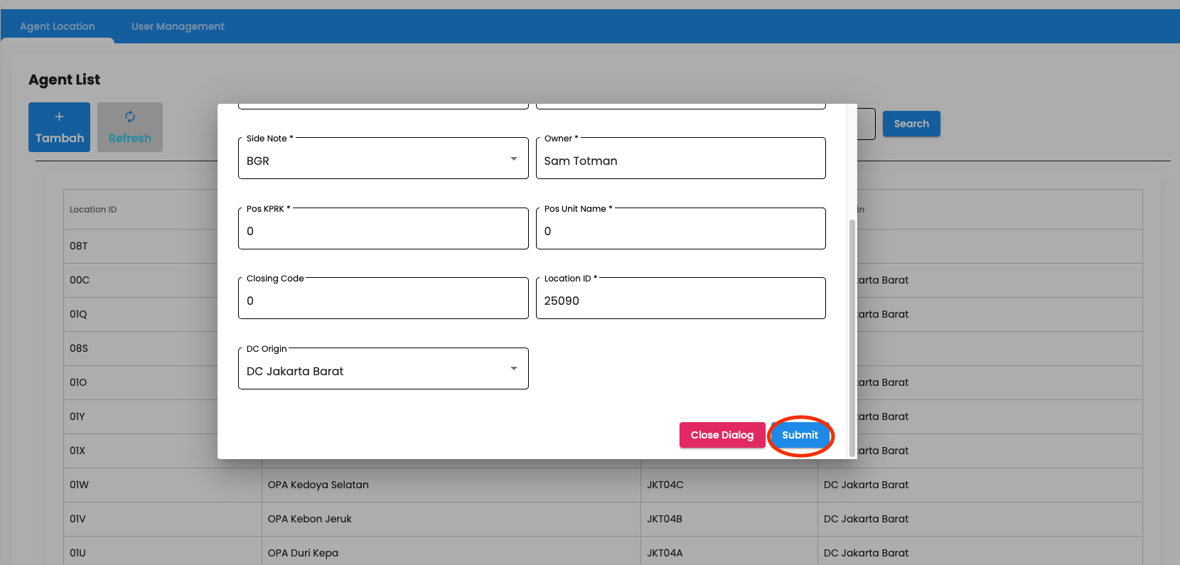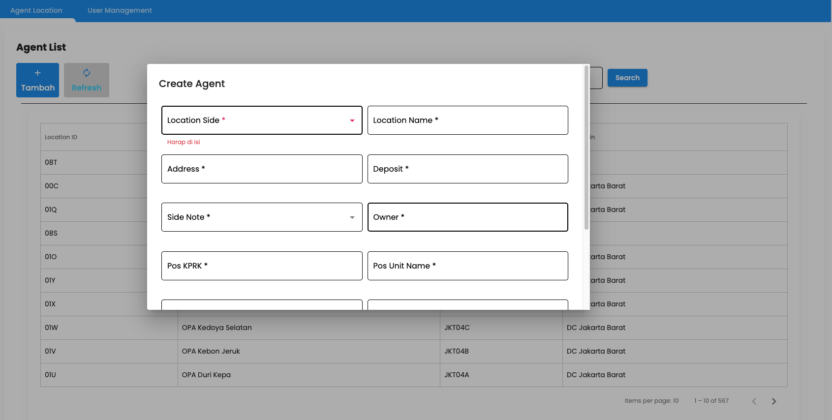 - Klik tombol tambah, lalu akan muncul form pengisian agent location